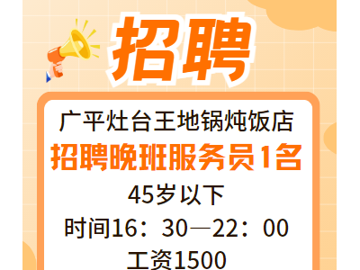 招聘:广平灶台王地锅炖饭店招聘晚班服务员1名,45岁以下,时间16:30—22:00,工资1500