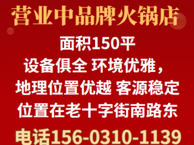 营业中品牌火锅店转让,面积150平,设备俱全,环境优雅,地理位置优越,客源稳定,位置在老十字街南路东。手慢无,价格详谈
