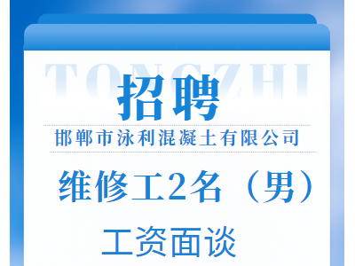 邯郸市泳利混凝土有限公司招聘:维修工2名(男),工资面谈。电话:0310-8115333李站长
