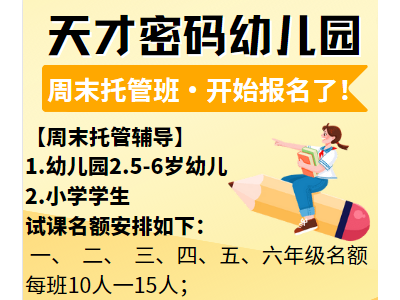 周末托管班开始招收:幼儿园,小学生,此信息转发朋友圈3天可享受:约课人数报满即可下周六开课;当天缴费赠送资料一套