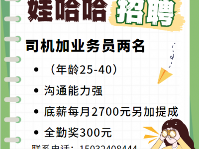 娃哈哈招聘:司机加业务员两名(年龄25-40)沟通能力强底薪每月2700元另加提成,全勤奖300元
