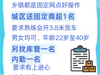 伊利奶招聘:乡镇司机兼业务员,城区送固定商超,熟练会开3.8米货车,22至40岁,另找库管,内勤,业务工资3000至6000。地址:广平北环路口