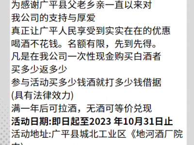 凡是在我公司一次性现金购买白酒者,买多少返多少,参与活动买多少钱酒就打多少钱借据,满一年后可拉酒,无酒可等价兑现。2023年10月31日止,地址广平县城北工业区地河酒厂院内