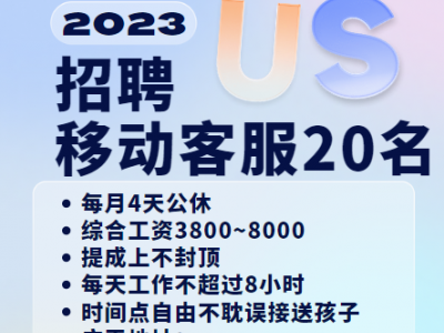 招聘移动客服,每月4天公休,综合工资3800~8000提成上不封顶,时间点自由不耽误接送孩子,广平地址:中央公园北门对面西50米。电话15529881993/17329363829/7210086