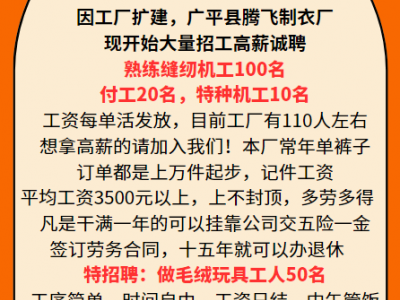 急聘:熟练缝纫机工100名(其中包括做毛绒玩具工人50名,工资日结)付工20名,月均3500以上,记件工资。急招后道检验,待遇丰厚。有免费午餐。微信15831813888电话19831081000