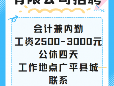 会计兼内勤,工资2500-3000元+公休四天