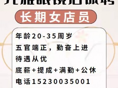 光雅眼镜店诚聘长期女店员,年龄20-35周岁。五官端正,勤奋上进。待遇从优,底薪+提成+满勤+公休,详情面谈