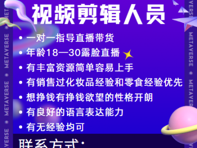 招聘带货主播,娱乐主播,运营,视频剪辑人员,一对一指导直播带货,18~30岁,露脸直播,简单容易上手,有无经验均可,性格开朗,有良好表达能力,联系16631089521微信同号地址:广平县建设西路