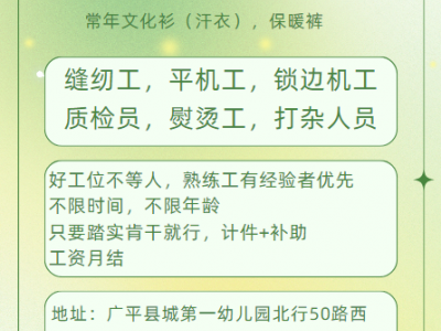 服装厂招工常年文化衫(汗衣),保暖裤:缝纫工,平机工,锁边机工,质检员,熨烫工,打杂人员,好工位不等人,熟练工有经验者优先,不限时间,不限年龄,只要踏实肯干就行,计件+补助,工资月结,地址:广平县城第一幼儿园北行50路西时刻便利店三楼(长春大道南段焦庄村)V电同步13102703360/17559573360