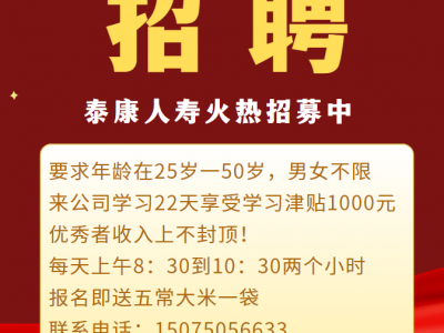 泰康人寿火热招募中,25岁一50岁,男女不限,来公司学习22天享受学习津贴1000元,优秀者收入上不封顶!每天上午8:30到10:30两个小时。报名即送五常大米一袋。