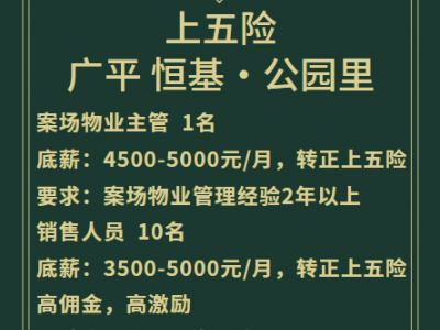 高薪招聘:案场物业主管,4500-5000元/月,转正上五险,案场物业管理经验2年以上;销售人员,3500-5000元/月,转正上五险。地点:广平恒基公园里销售中心,联系18447276913武总
