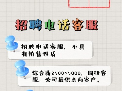 招聘电话客服,不具有销售性质,综合薪2500~5000,调研客服,公司提供意向客户。联系微信同号,地址:十里铺新民居附近