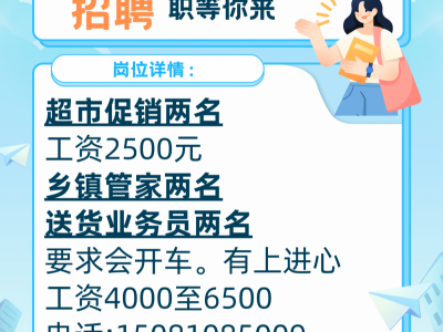 招聘超市促销两名。工资2500元。乡镇管家两名。送货业务员两名。要求会开车。有上进心,工资4000至6500。
