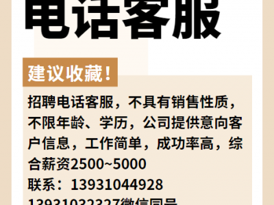 招聘电话客服,不具有销售性质,不限年龄、学历,公司提供意向客户信息,工作简单,成功率高,综合薪资2500~5000