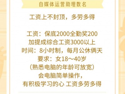 招聘:自媒体运营助理数名(女18~40岁)工资:保底2000全勤奖200,加提成综合工资3000以上,8小时制,公休俩天,地点:广平县大众创业孵化基地