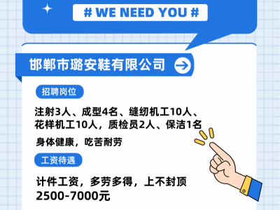 招聘:注射3人、成型4名、缝纫机工10人、花样机工10人,质检员2人、保洁1名 。要求:身体健康,吃苦耐劳工资:2500-7000元,计件工资,多劳多得 ,上不封顶。尹女士15131034916 地址:广平县城南工业园
