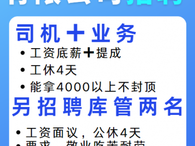 广平玮清商贸有限公司招聘司机➕业务,工资底薪➕提成,工休4天,能拿4000以上不封顶,另招聘库管两名,工资面议,公休4天,敬业吃苦耐劳,有团队精神。电话13722598522,15081701177