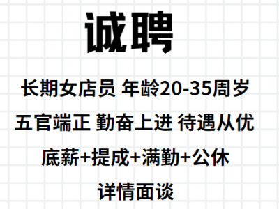 光雅眼镜店诚聘长期女店员,年龄20-35周岁。五官端正,勤奋上进。待遇从优,底薪+提成+满勤+公休,详情面谈