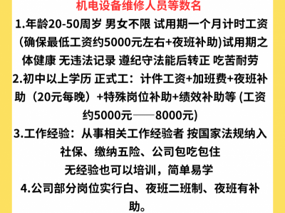 招聘生产线操作人员 品质人员 库房管理人员 包装人员 机电设备维修人员等数名 年龄20-50周岁 男女不限 工资待遇 5500-8000 不等 包吃包住,地址:江苏省淮安市淮阴区 淮河东路610号