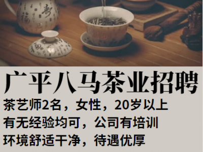 广平八马茶业招聘茶艺师2名,女性,20岁以上,有无经验均可,公司有培训。环境舒适干净,待遇优厚,基本工资+全勤奖+业绩奖+其它补助,电话13473042200,15100002217,2528558