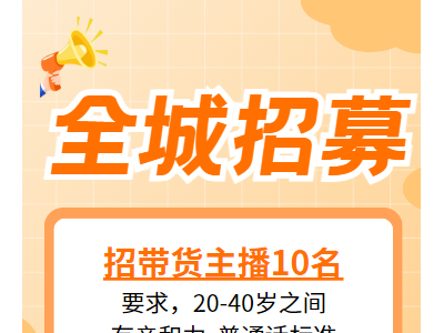 全城招募带货主播10名,20-40岁,普通话标准。有经验者优先录用,无经验者一对一指导培训。保底3000+提成+奖金;招仓库发货人员5名,要求会简单电脑操作。