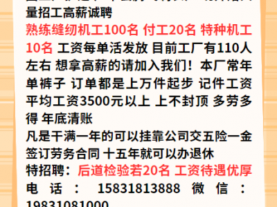 因工厂扩建,广平县腾飞制衣厂,现开始大量招工高薪诚聘熟练缝纫机工100名,付工20名,特种机工10名,工资每单活发放,目前工厂有110人左右,想拿高薪的请加入我们!本厂常年单裤子,订单都是上万件起步,记件工资,平均工资3500元以上,上不封顶,多劳多得 ,年底清账
