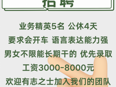 广平洋河酒业招聘业务精英5名,公休4天,要求会开车,语言表达能力强,男女不限能长期干的优先录取工资3000到8000元欢迎有志之士加入我们的团队…… 联系电话15303304520 15188824094