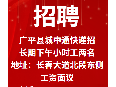 广平县城中通快递招长期下午小时工两名。地址长春大道北段东侧工资面议。