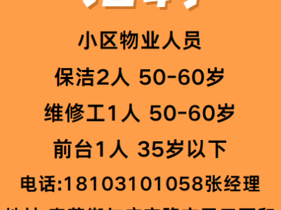招聘小区物业人员:保洁2人50一60岁 维修工1人,50一60岁,前台1人,35岁以下