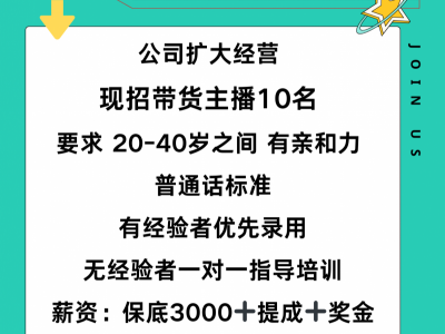 公司扩大经营,现招带货主播10名,要求,20-40岁之间,有亲和力,普通话标准。有经验者优先录用。无经验者一对一指导培训。薪资:保底3000➕提成➕奖金