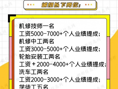 广平德国马牌养车连锁店招聘:机修技师一名 工资5000-7000+个人业绩提成;机修中工两名 工资3000-5000+个人业绩提成;轮胎安装工两名 工资2000-4000+个人业绩提成;洗车工两名 工资2000-3000+个人业绩提成;学徒工五名 工资1000 包午餐包住宿