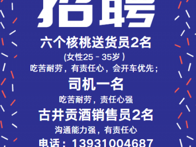 招聘:六个核桃送货员2名(女性25-35岁)吃苦耐劳,有责任心,会开车优先;