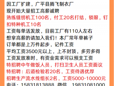 因工厂扩建,广平县腾飞制衣厂,现开始大量招工高薪诚聘熟练缝纫机工100名,付工20名,打结,锁眼,钉扣,特种机工10名,工资每单活发放,目前工厂有110人左右,想拿高薪的请加入我们!本厂常年单裤子,订单都是上万件起步,记件工资,平均工资3500元以上,上不封顶,多劳多得