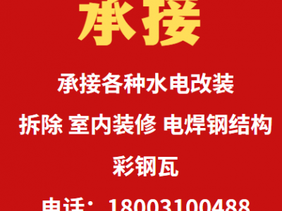 承接各种水电改装,拆除,室内装修,电焊钢结构,彩钢瓦