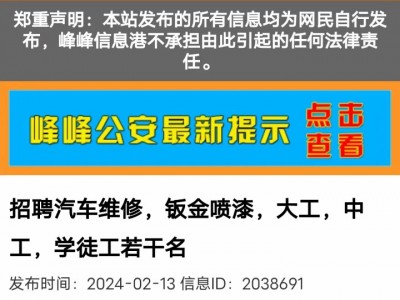 招聘汽车维修,钣金喷漆,大工,中 工,学徒工若干名 发布时间:2024-02-13信息ID:2038691 招聘汽车维修,钣金喷漆,大工,中工,学 徒工若干名,大工工资5000-8000,学徒 工1500起,工资月结,管吃管住,工作地 点峰峰矿区峰峰镇,联系电话 苗先生。 温馨提示:联系我时请说明是在峰峰信息港上看到的。 联系电话: