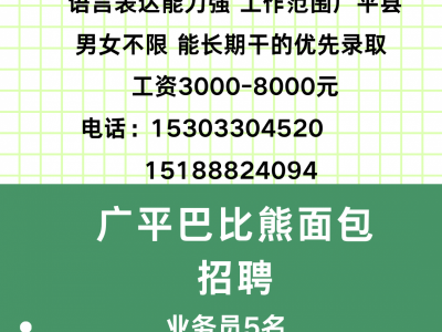 洋河 海天梦酒 招聘业务精英3名,公休4天,要求会开车,语言表达能力强,工作范围广平县,男女不限能长期干的优先录取工资3000到8000元欢迎有志之士加入我们的团队…… 联系电话15303304520 15188824094