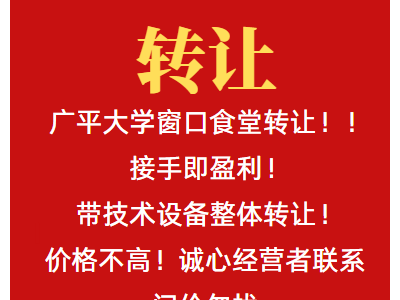 转让,招聘:广平大学窗口食堂转让!!接手即盈利!带技术设备整体转让!价格不高!诚心经营者联系 问价勿扰 。另外招聘服务员两名,要求:工作认真踏实!