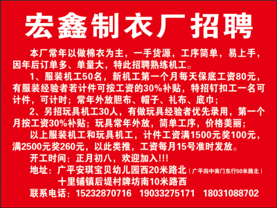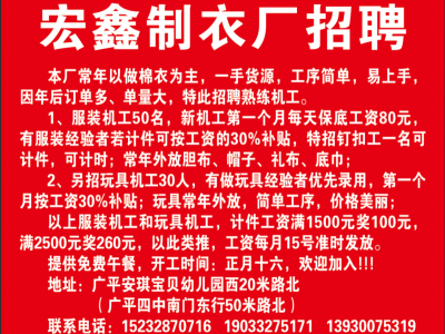 宏鑫制衣厂招聘 服装机工50名 钉扣工一名 可计件,可计时;玩具机工30人 开工时间:正月初八,欢迎加入!!!地址:广平安琪宝贝幼儿园西20米路北(广平四中南门东行50米路北)十里铺镇后堤村牌坊南10米路西 电话:15232870716 19033275171 18031088702