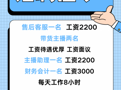 招聘售后客服一名 工资2200 每天工作8小时 月休四天 带货主播两名 工资待遇优厚 工资面议 主播助理一名 工资2200工作时间8小时 月休四天 财务会计一名 工资3000 每天工作8小时 月休四天 工作地点广平安居附近