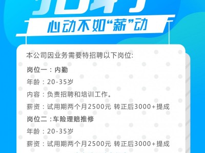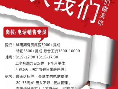 招聘:电话销售专员 试用期有责底薪3000+提成 转正3500+提成 综合工资3500-10000,不招学生 短期工