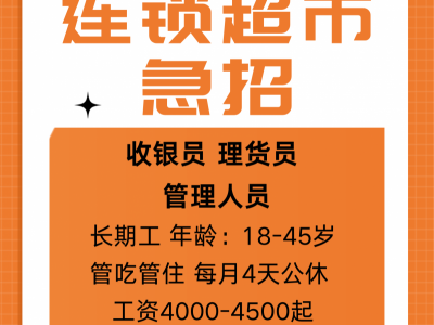 连锁超市急招:收银员,理货员,管理人员,长期工,年龄:18-45岁 管吃管住 每月4天公休 工资4000-4500起 上不封顶 地点:北京