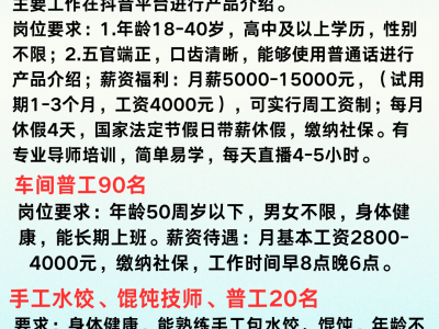 岗位要求:1.年龄18-40岁,高中及以上学历,性别不限;2.五官端正,口齿清晰,能够使用普通话进行产品介绍;