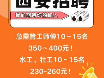西安招聘:急需管工师傅10~15名。350~400元!水工、壮工10~15名。230-260元!工资电话详谈!