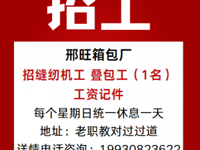 招工,邢旺箱包厂招缝纫机工,叠包工(1名),工资记件,每个星期日统一休息一天。地址,老职教对过过道。详情电话咨询