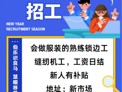 招会做服装的熟练锁边工,缝纫机工,工资日结,新人有补贴,地址:新市场