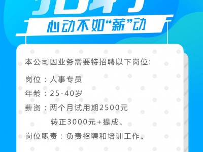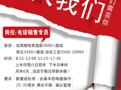 招聘:电话销售专员 试用期有责底薪3000+提成 转正3500+提成 综合工资3500-10000,不招学生 短期工