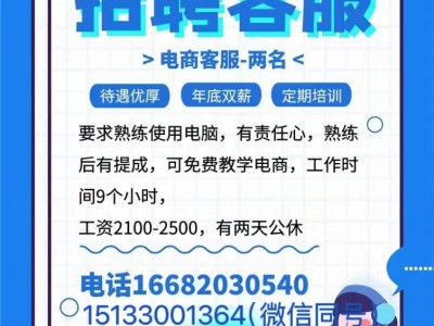 招聘电商客服两名,要求熟练使用电脑,有责任心,熟练后有提成,可免费教学电商,工作时间9个小时,工资2100-2500,有两天公休,工作地址,广平县袁庄创业孵化基地,联系电话16682030540/15133001364(微信同号)