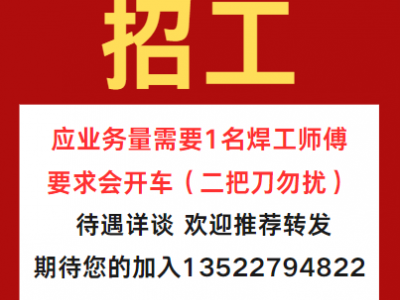应业务量需要1名焊工师傅,要求会开车(二把刀勿扰), 待遇详谈,欢迎推荐转发,期待您的加入!