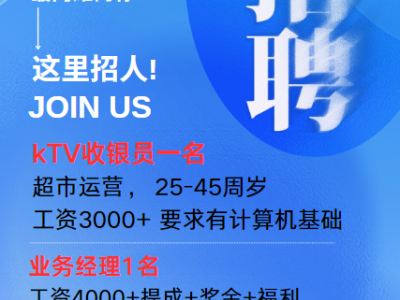 诚聘kTV收银员一名,工资3000。