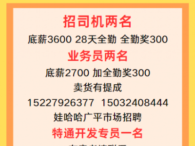 业务员两名 底薪2700,加全勤奖300。卖货有提成